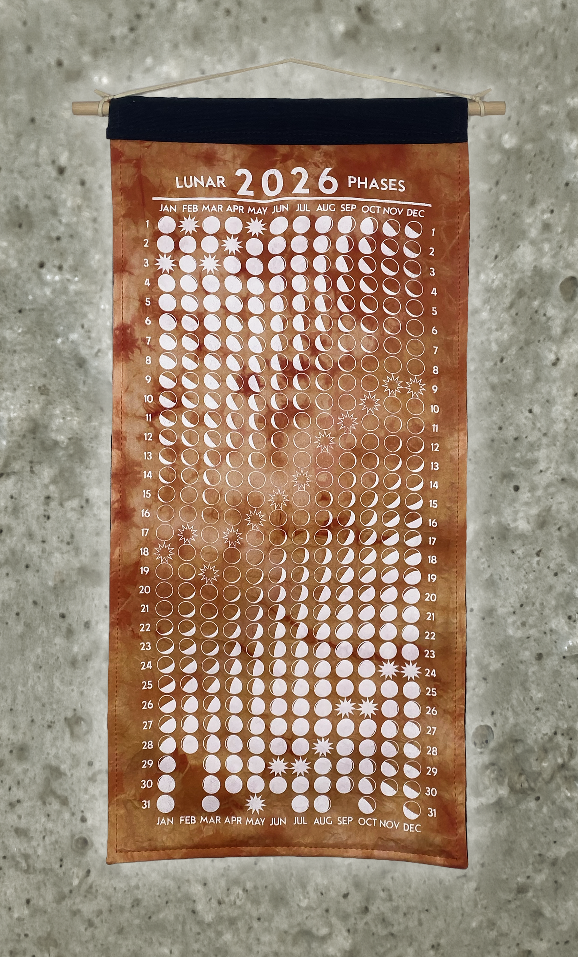 Lunar phase calendar, silk-screened on 100% silk charmeuse fabric. Hand-dyed in small batches using natural plant and insect dye extracts. Mounted on 100% cotton canvas backing. One-of-a-kind and handmade.