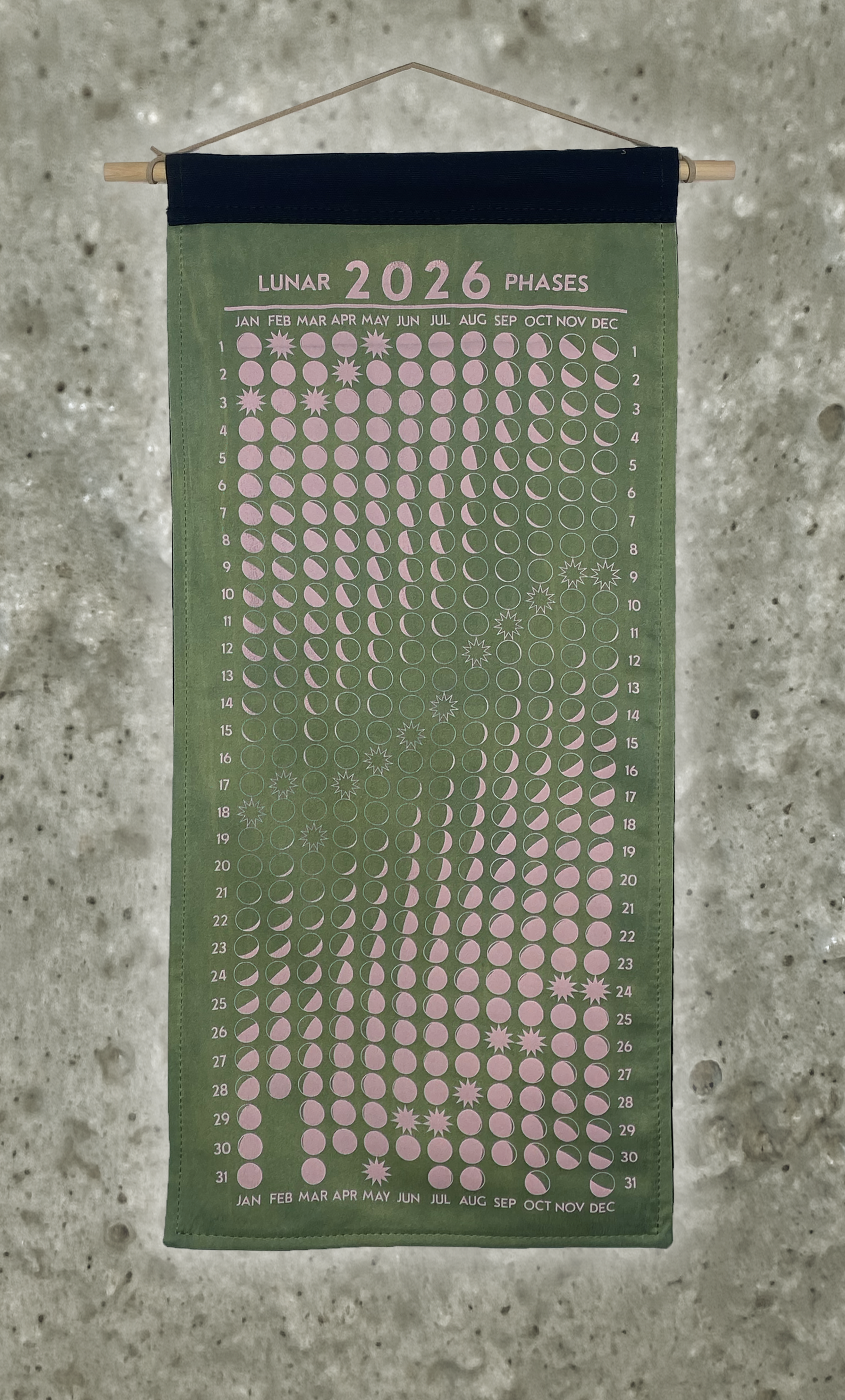 Lunar phase calendar, silk-screened on 100% silk charmeuse fabric. Hand-dyed in small batches using natural plant and insect dye extracts. Mounted on 100% cotton canvas backing. One-of-a-kind and handmade.