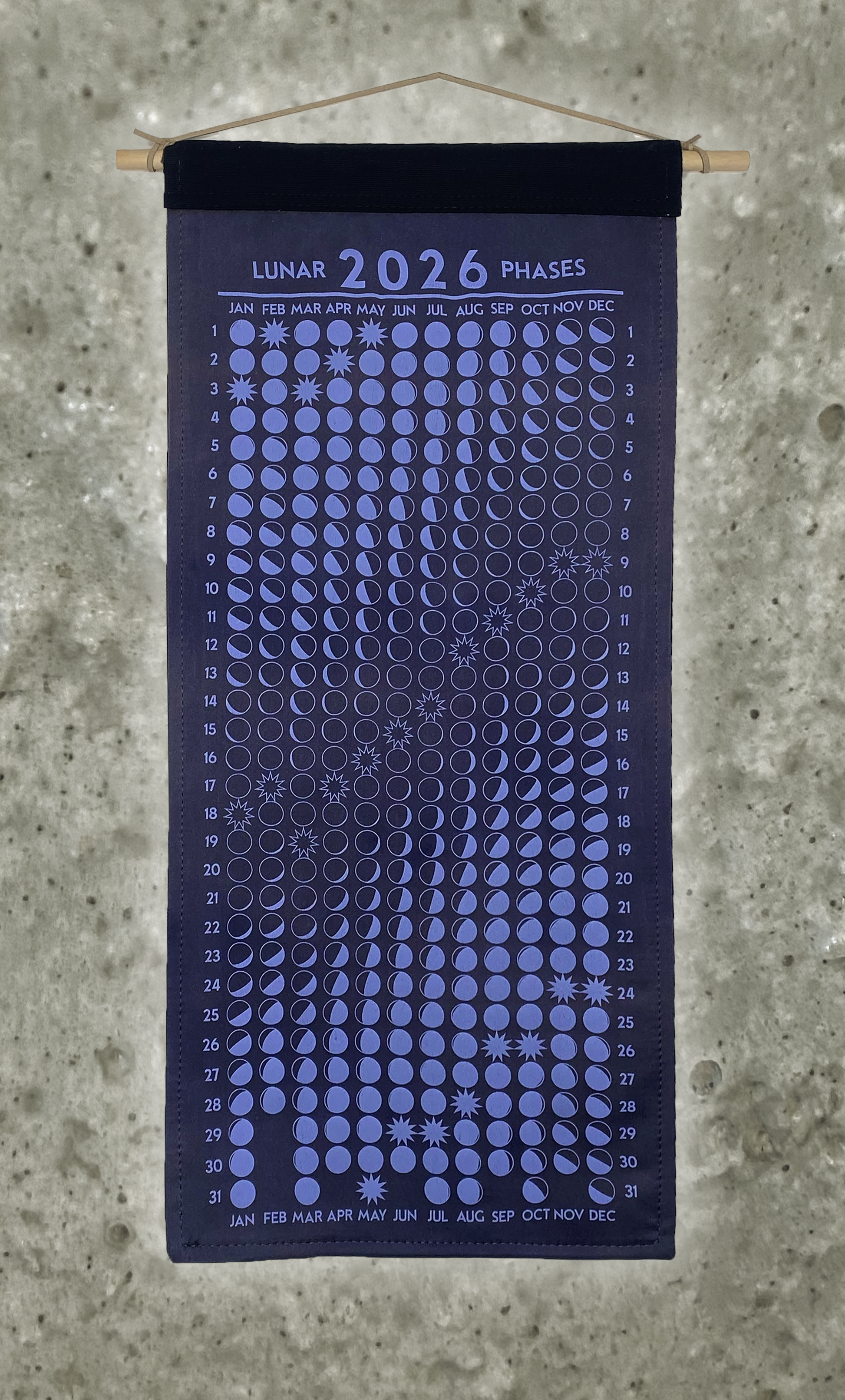 Lunar phase calendar, silk-screened on 100% silk charmeuse fabric. Hand-dyed in small batches using natural plant and insect dye extracts. Mounted on 100% cotton canvas backing. One-of-a-kind and handmade.