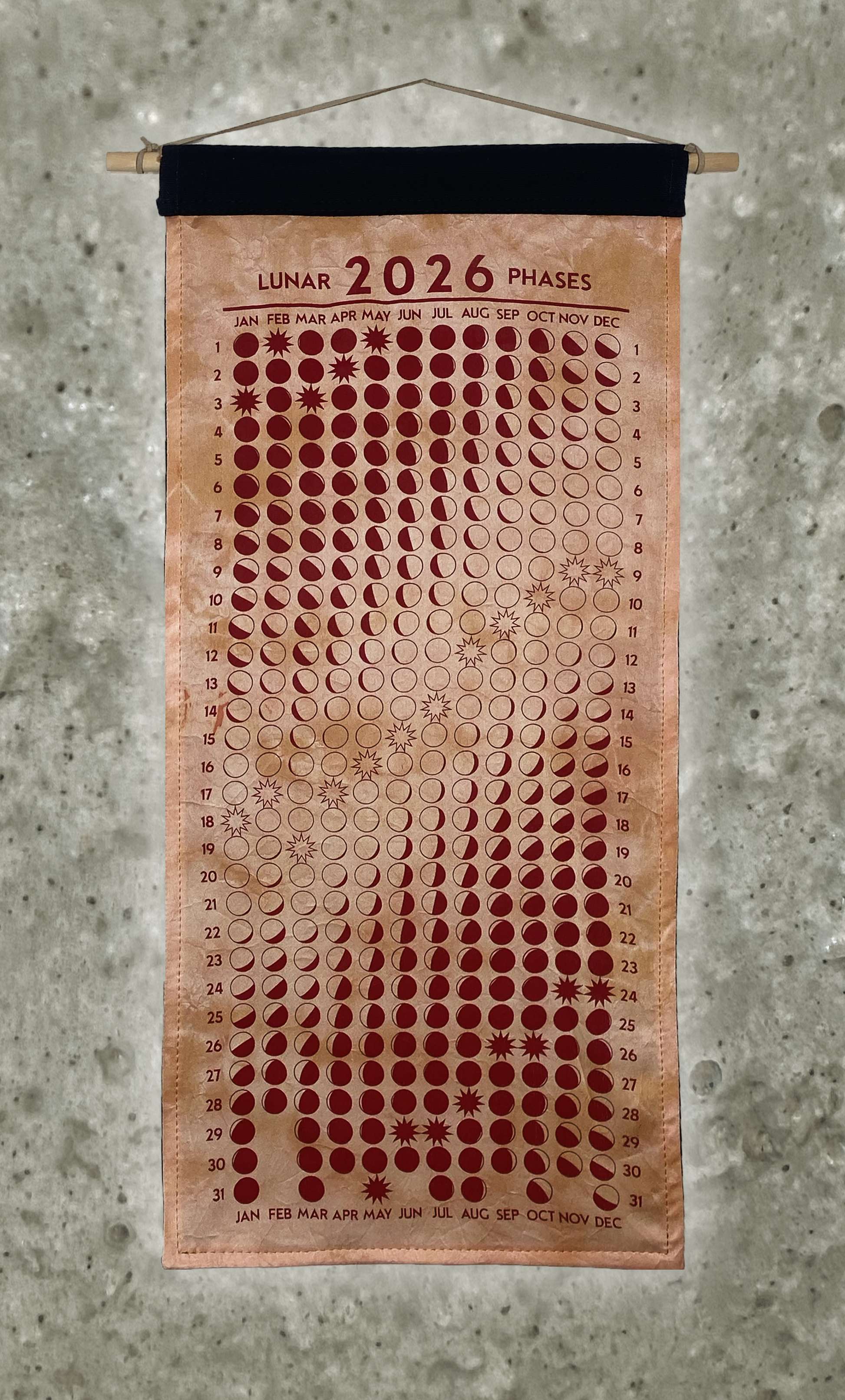 Lunar phase calendar, silk-screened on 100% silk charmeuse fabric. Hand-dyed in small batches using natural plant and insect dye extracts. Mounted on 100% cotton canvas backing. One-of-a-kind and handmade.